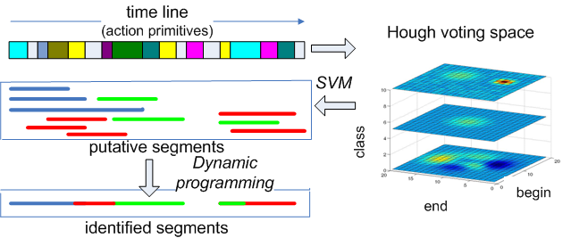 In this work, we provide a discriminative framework for online simultaneous segmentation and classification of visual actions, which deals effectively with unknown sequences that may interrupt the known sequential patterns. To this end we employ Hough transform to vote in a 3D space for the begin point, the end point and the label of the segmented part of the input stream. An SVM is used to model each class and to suggest putative labeled segments on the timeline. To identify the most plausible segments among the putative ones we apply a dynamic programming algorithm, which maximises an objective function for label assignment in linear time. The performance of our method is evaluated on synthetic as well as on real data (Weizmann and Berkeley multimodal human action database). The proposed approach is of comparable accuracy to the state of the art for online stream segmentation and classification and performs considerably better in the presence of previously unseen actions..