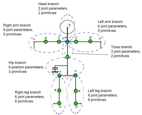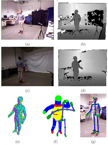 Left: Graphical illustration of the proposed method. Two RGB frames ((a), (c)) and the corresponding depth maps ((b), (d)). The volume (e) occupied by the person is reconstructed using the depth maps. The proposed method fits the employed human body model (f) to this volume, recovering the body articulation (g). Right: Definition of human body branches. The perturbation of the torso and hip branches results in changes in the parameters of their child branches. Model points with a red “+" denote joints whose 3D position is taken into account in defining the tracking error in the quantitative experimental evaluation of the method.