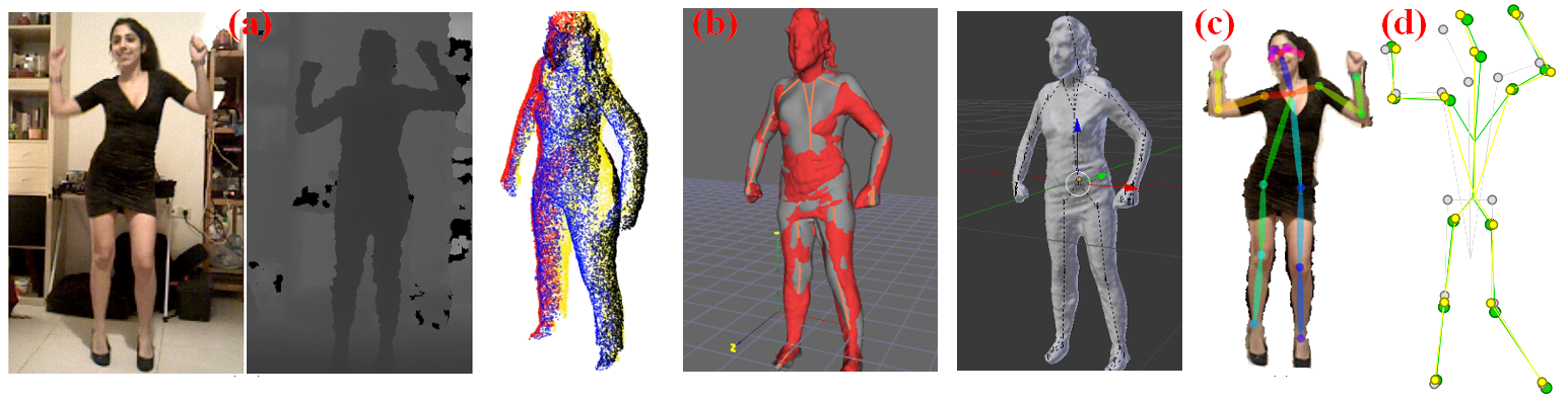 The proposed approach for 3D human pose estimation operates as follows. (a) The input to the method is a sequence of RGBD frames. (b) We leverage on personalized, parametric, skinned human body models that can be acquired easily. (c) We also employ OpenPose for the estimation of 2D human body joints. We define a hybrid approach for fitting the model (b) in the observations (a) given the hints provided by the 2D joints estimation (c). The result of this process is visualized in (d). The green skeleton is the ground truth, the gray is the neural network suggestion and the yellow is the result of the proposed approach. Although the neural network estimation is far from the ground truth, the proposed method manages to estimate accurately the 3D human pose because of the high quality model and the utilization of depth information.