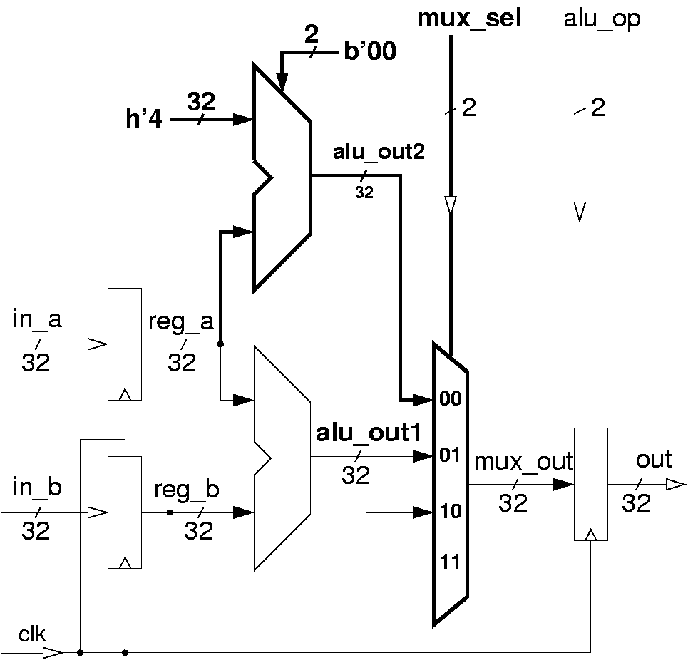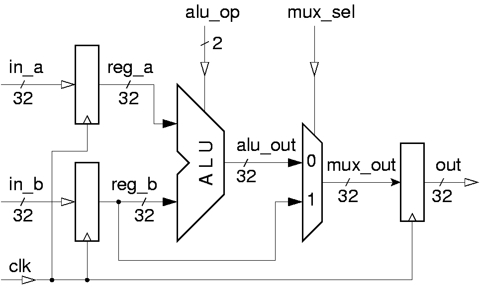 out, in_a, in_b, alu_op, mux_sel, clk.